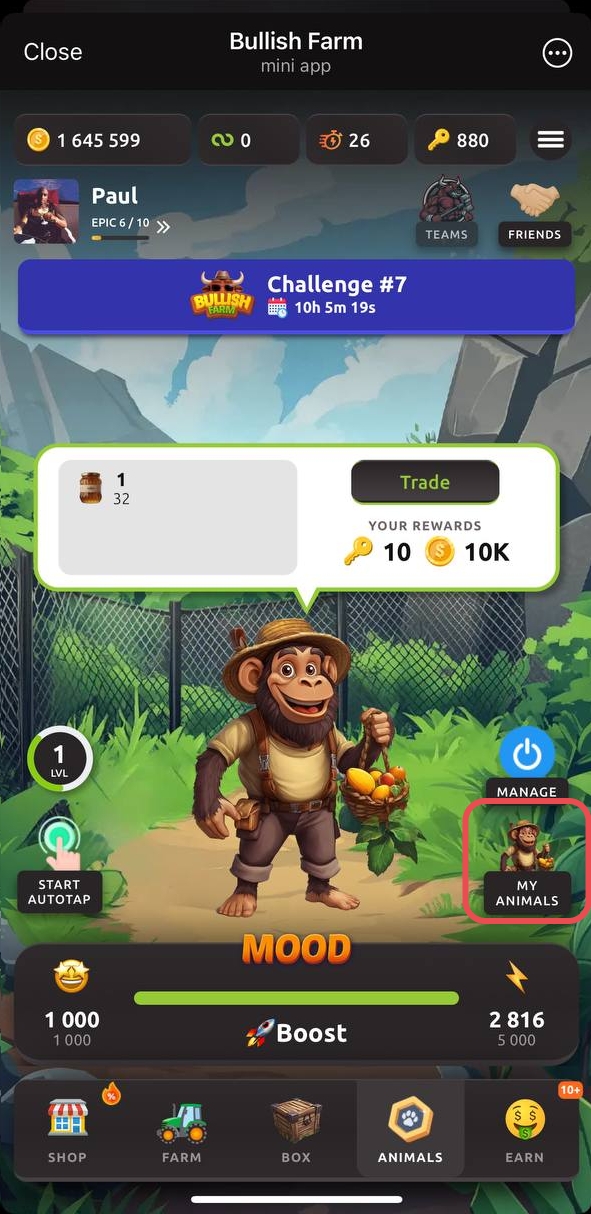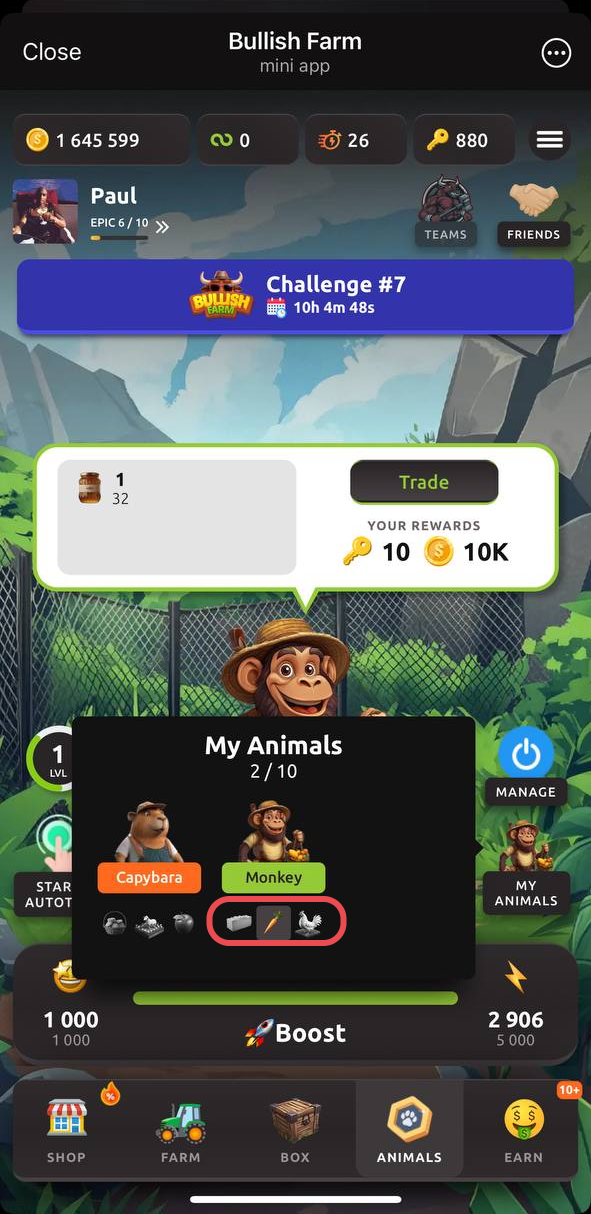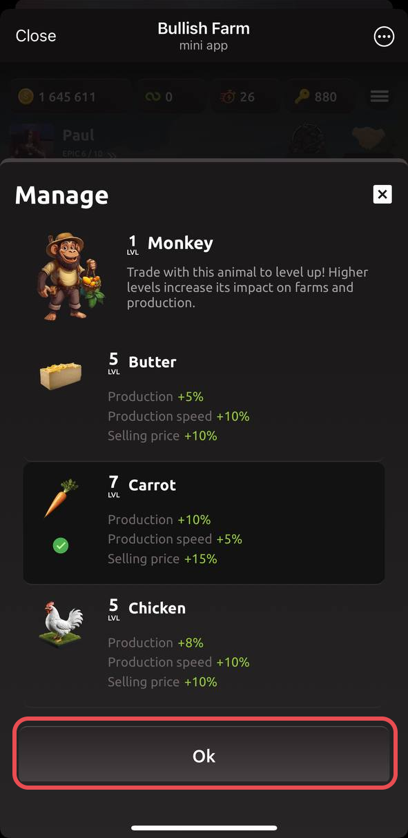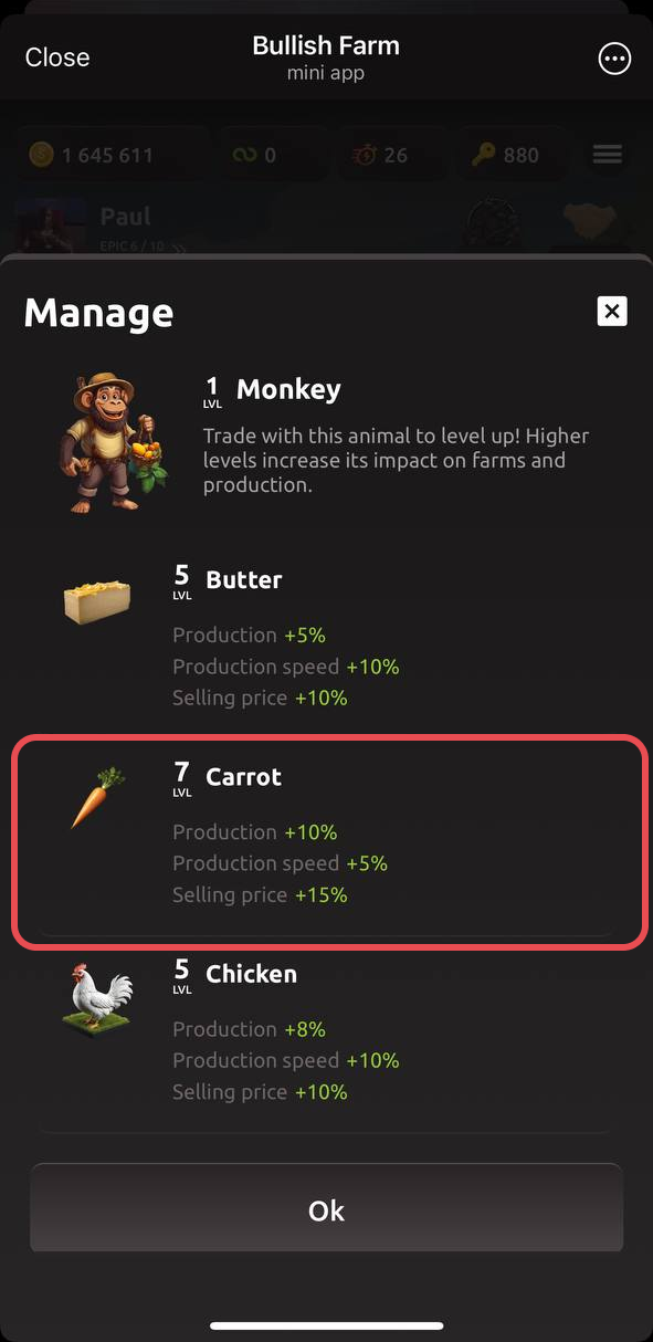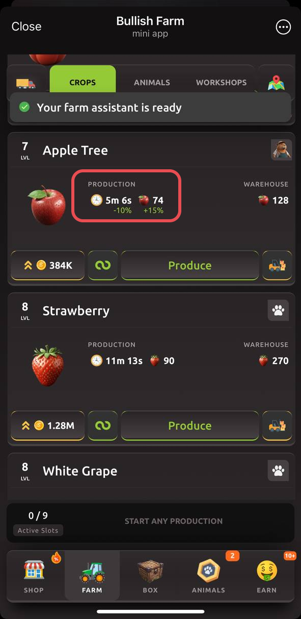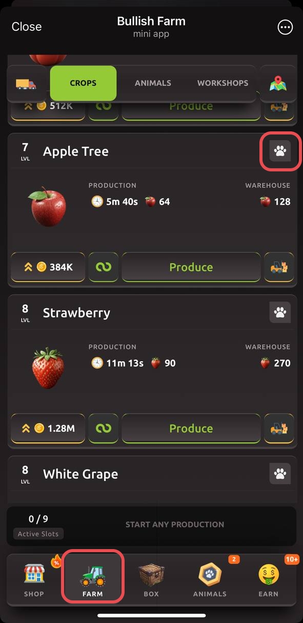 Abre la pestaña de granjas y selecciona la producción que deseas mejorar con el compañero.