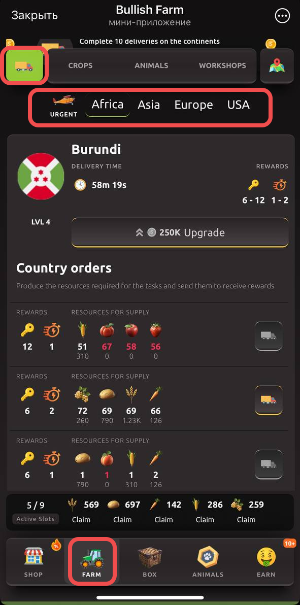 En Bullish Farm, los continentes representan regiones clave donde se encuentran los países que necesitan recibir productos. Los jugadores pueden enviar productos a diferentes países para ganar llaves y potenciadores. Esta es una parte importante del juego para aumentar los ingresos y avanzar en el juego.