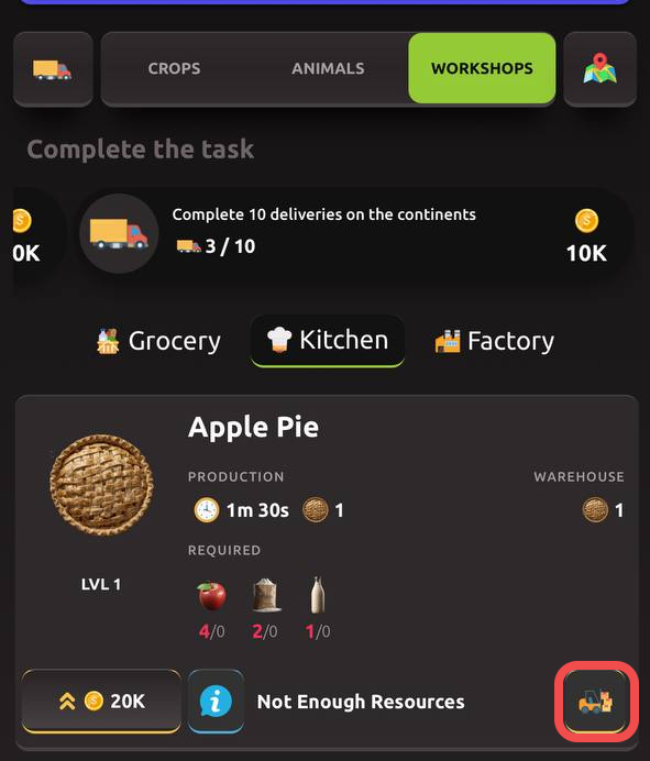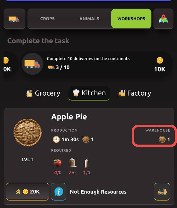 Cantidad en el almacén: muestra cuántas unidades de un recurso (por ejemplo, pasteles de manzana) ya tienes en stock. Estos son los recursos que ya has producido y que puedes utilizar para vender o completar pedidos.