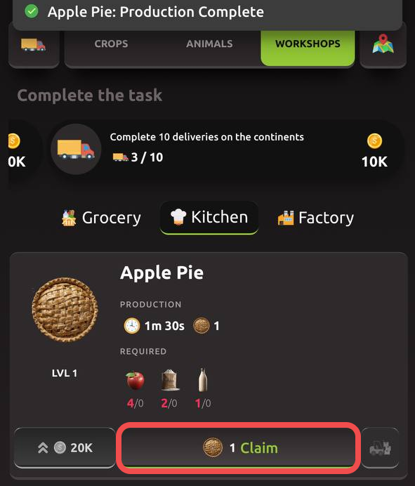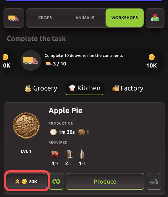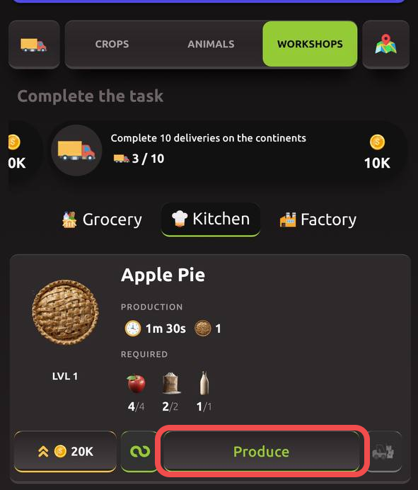 Botón 'Producir': con este botón inicias la producción de recursos en la granja. Tan pronto como la producción esté completa, este botón cambiará a 'Reclamar'.